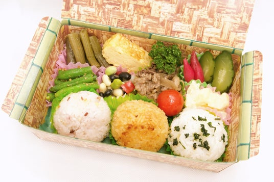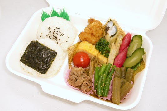 【品目】十和田産米おにぎり2個(鮭、梅干し)/青森県産和牛しぐれ煮/長芋と大葉の春巻き(梅肉添え)/青森県産ごぼうの天ぷら/国産鶏の唐揚げ/いんげんの胡麻和え/ふきの油炒め/自家製きゅうりの漬物/茗荷の漬物/卵焼き/ミニトマト
