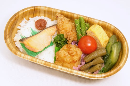 【品目】青森県産米/焼き鮭/国産鶏の唐揚げ/いんげんの胡麻和え/ふきの油炒め/自家製きゅうりの漬物/卵焼き/ミニトマト/梅干し