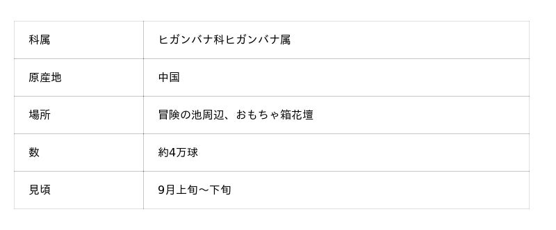 現在は冒険の池周辺を中心に、水辺や木陰を真っ赤に染める光景が見られますが、9月下旬にはおもちゃ箱花壇にて白いヒガンバナも観賞することができます。