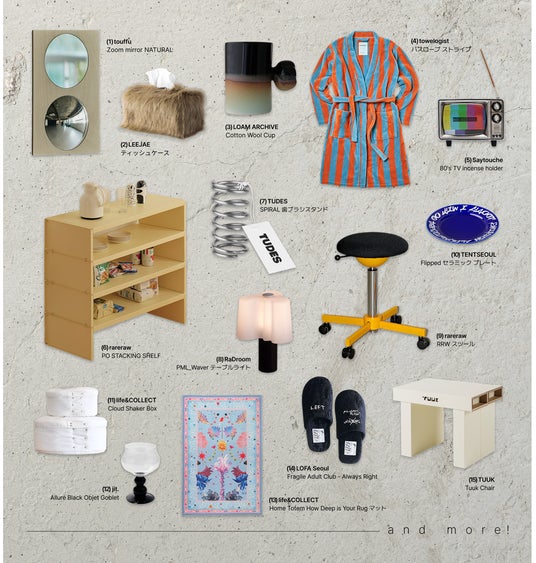 rareraw,46month,life&COLLECT,Nukit,Kand,MASSTIGE DECO,FLOPY,rhombus lab,TUUK,Moss carpet,B.MOTTOR LIVING,TENTSEOUL,make a pottery,DORMOR,FLAT POINT,FRANKLY!,SEINE PARIS,Saytouche,Ritten,Glossy,YOU LIKE WHAT,touffu,ONDO,doingtools,hemin ceramics,LUMIR,wvym,Ogre,WELCOMETOCCC,ACID LOW,TUDES,LEEJAE,HORANG,VODM,Chez Nous a Paris,TWB,towelogist,LOFA Seoul,studio samool,VILLA RECORDS,Offset SEOUL, ほか多数。