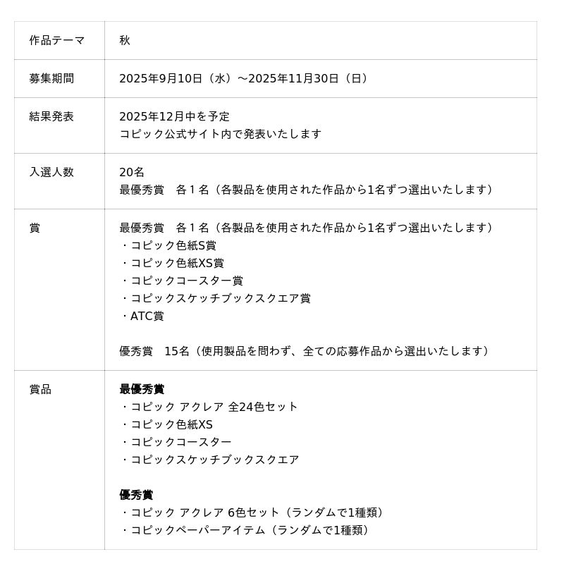 ・賞品の発送の都合上、入選対象者は日本国内に在住している方に限らせていただきます。入選対象者を限定しないコンテストとしては、コピックアワード、コピック公式Instagramアカウントでのコンテストがありますので、そちらもぜひチェックしてみてください。