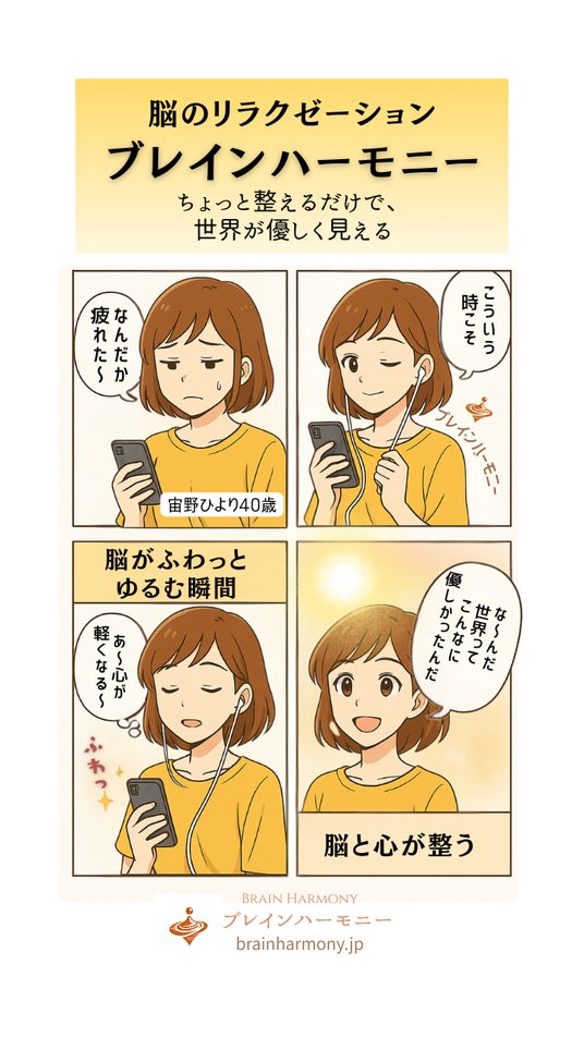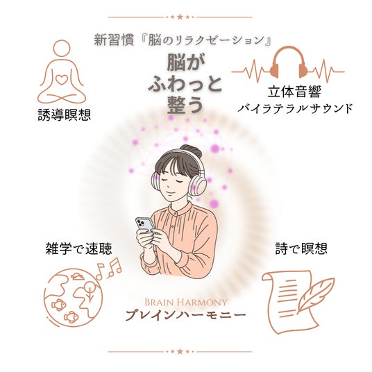 - 「ブレインハーモニー」は、スマホやPCで"聴くだけ"で体験できる、以下の4つの要素を融合した独自のセルフケアプログラムです- 立体音響(バイラテラルサウンド):左右から交互に響く特殊音響で脳を揺らす