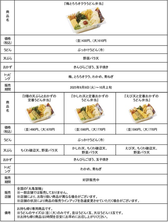 株式会社丸亀製麺(本社:東京都渋谷区、代表取締役社長:山口 寛)が展開する、食の感動体験を探求し、手づくり・できたてにこだわる讃岐うどん専門店「丸亀製麺」は、いつでもどこでも打ち立てのうどんを楽しんでいただける、お持ち帰り専用商品「丸亀うどん弁当」の新作として『梅とろろオクラうどん弁当』を2025年9月9日(火)から全国の丸亀製麺にて期間限定で販売します。この秋は、手に取りやすい430円から全4種のラインアップをご用意しています。
