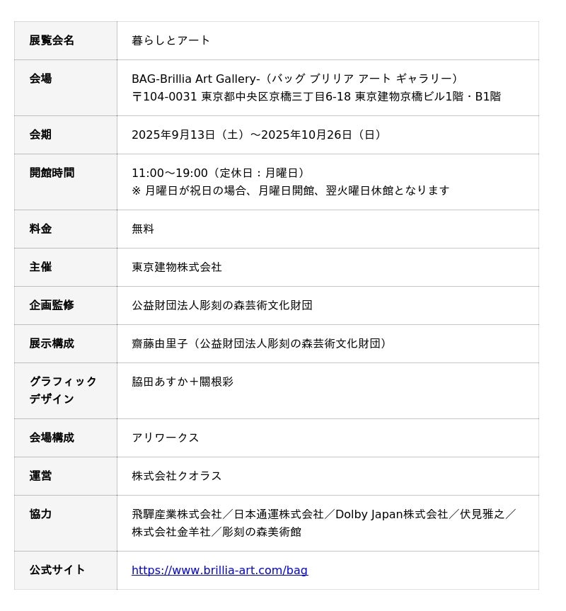 東京建物株式会社は、2025年9月13日(土)から2025年10月26日(日)まで、「BAG-Brillia Art Gallery-(バッグ ブリリア アート ギャラリー、以下「BAG」)」で展覧会「暮らしとアート」(以下「本展」)を開催します。2021年10月の開館以来、約4年にわたり東京・京橋で運営してきたBAGは、再開発に伴い2025年10月26日に閉館することが決定し、本展が最後の展覧会となります。