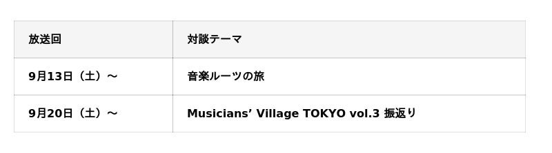 今回の放送では、Aile The Shotaさんがアーティストを目指したきっかけや、オーディションを経て現在の音楽活動に至るまでを深ぼる音楽ルーツの旅と、8月に行われたイベント「Musicians' Village TOKYO vol.3」の様子をRyo'LEFTY'Miyataと共に振り返ります。さらに、Aile The ShotaさんとRyo'LEFTY'Miyataがイベントで魅せた公開コライトでのデモ音源なども紹介予定。多くのアーティストに楽曲提供を行う2人による楽曲作りやライブへの拘りもたくさん語っています。