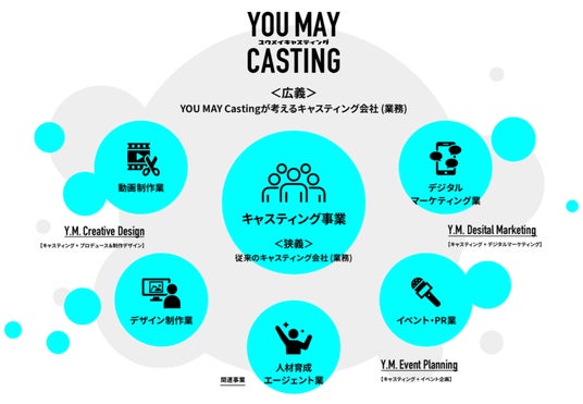 事業内容:キャスティング事業(YOU MAY Casting/aModel commune)、制作事業、発掘・育成・支援事業(AZUKARI/モデルインストラクター協会/p.m.design)、タレントエージェント事業、スタジオ事業