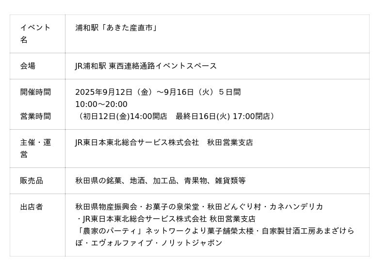 2025年9月12日(金)~16日(火)に秋田県の地産品販売や観光PRをします!秋田でしか買えない商品も多数ご用意!また13日(土)には列車荷物輸送サービス<はこビュン>を活用し秋田の「旬」をお届け!
