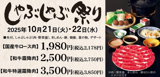 株式会社木曽路(本社:愛知県名古屋市、代表取締役社長:中川晃成)は、しゃぶしゃぶ・日本料理 木曽路にて2025年10月21日(火)・22日(水)の2日間に、「しゃぶしゃぶ祭り」を開催いたします。