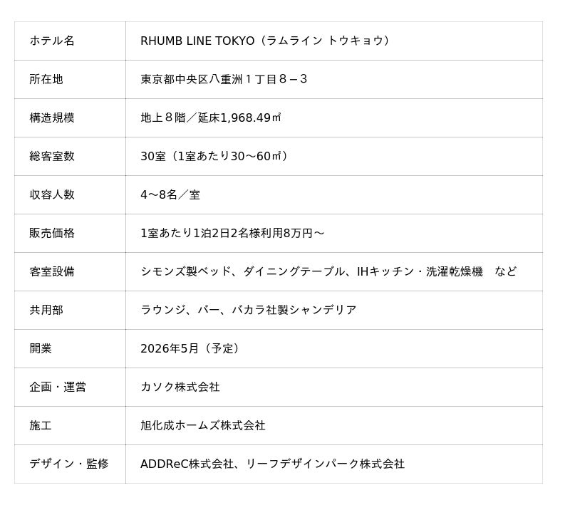 ホテルの企画・開発から運営までを一貫して手がけるカソク株式会社(本社:東京都新宿区、代表取締役:新井 恵介)は、2026年5月、東京都中央区・八重洲エリアに全30室のアパートメントホテル「RHUMB LINE TOKYO」を開業します。本プロジェクトは、旭化成ホームズ株式会社(本社:東京都千代田区、代表取締役社長:大和久 裕二)が施工を、ADDReC株式会社(本社:東京都新宿区、代表取締役:福島 大我)がトータルプロデュースを担当。※開業日は変更になる可能性があります。