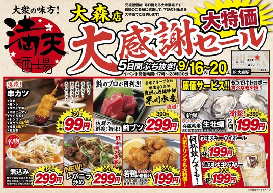 【衝撃の低価格!串カツ、生牡蠣が100円以下】大森の『満天酒場』が9/16(火)から9/20(土)の5日間限定で大感謝セール!