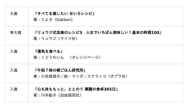 「今年はせいろ蒸しや薬膳料理など、立ち止まってじっくりと自分の生活を見つめ直すタイプの料理レシピ本が多く登場しました。いままで、時短、簡単などのキーワードが多かったですが、今年は違った方向性の本が受賞したので、書店店頭が活気づくのではないかと期待しております。」