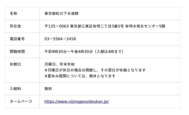 ※具体的な内容や最新情報は、東京都虹の下水道館公式ホームページでお知らせいたします。