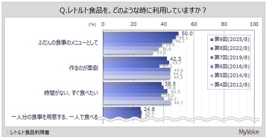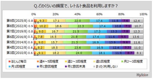 マイボイスコム株式会社(東京都千代田区、代表取締役社長:高井和久)は、9回目となる『レトルト食品の利用』に関するインターネット調査を2025年8月1日~7日に実施しました。