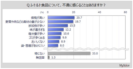 ■レトルト食品の不満点は「価格が高い」「具材の量が少ない」が2割前後、「添加物が多い」「味が濃すぎる」「塩分量が多い」が各10%台