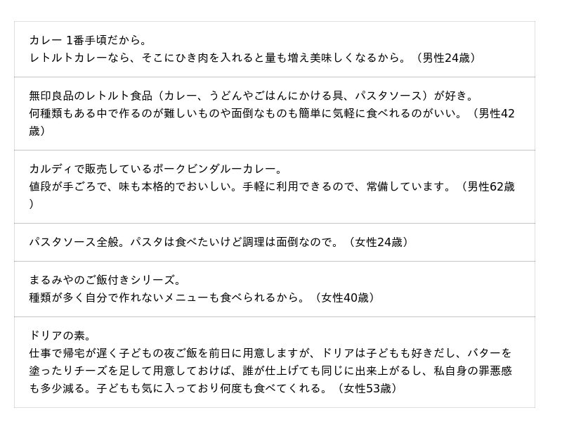 レトルト食品の利用状況や購入状況などについて聞いています。調査結果をお知らせいたします。
