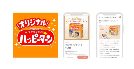 亀田製菓は、国内米菓市場において約30%のシェアを占めるリーディングカンパニーです。お米の恵みを美味しさ・健康・感動という価値に磨き上げ、お客様の生活に喜びと潤いを提供することを使命としています。「亀田の柿の種」や「ハッピーターン」などのロングセラーブランドをはじめ、「亀田のあられ・おせんべい」は多くの方々に親しまれています。なかでも、「お客様に幸せが戻ってくるように」という願いが込められネーミングされた「ハッピーターン」は、1976年に発売を開始以来、40年以上にわたり、お客様に愛されている亀田製菓の代表商品です。亀田製菓では、「ハッピーターン」の発売48年を迎えた昨年、亀田製菓が運営する専用のウェブサイトにて、自分だけのオリジナルデザインの「ハッピーターン」が作れる新サービス『オリジナルハッピーターン』(※5)の提供を開始されています。 『オリジナルハッピーターン』とは、お好きな写真とメッセージを入れて自分だけのパッケージを作成できるサービスです。お誕生日、結婚式といったハレの日はもちろん、部活動や文化祭といったスクールイベントの思い出作りになど、特別な想いを届けられるオリジナルの「ハッピーターン」を作成できます。この度、新たなギフト需要の獲得およびさらなる商品認知の獲得を目的に、「eGift System」を導入いただき、『オリジナルハッピーターン』のeギフトの発行および販売を開始されました。