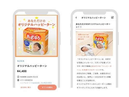 eギフトプラットフォーム事業(※1)を展開する株式会社ギフティ(本社:東京都品川区/代表取締役:太田 睦、鈴木 達哉/以下、ギフティ)は、亀田製菓株式会社(本社:新潟県新潟市、代表取締役社長COO:高木 政紀/以下、亀田製菓)に、eギフトやチケットを発行し販売する「eGift System」(※2)サービスを提供いたしました。これにより、亀田製菓が提供する自分だけのオリジナルデザインの「ハッピーターン」が作れるサービス『オリジナルハッピーターン』をeギフト化し、ギフティが運営するWEBサービスおよびスマートフォン向けアプリ「giftee(R)」(※3)で2025年8月21日(木)より、eギフトを活用した法人・自治体向けサービス「giftee for Business」(※4)では2025年9月5日(金)より、『オリジナルハッピーターン』のeギフトの販売を開始いたしましたので、お知らせいたします。
