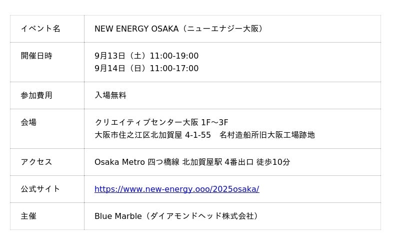 関西初開催となる「NEW ENERGY OSAKA」は、アートやデザイン、クラフト、ファッション、ビューティー、音楽、フードまでを網羅する"大人のための文化祭"。舞台は大阪・名村造船所跡。150組を超える国内外のクリエイターが集い、工場跡の非日常空間を彩ります。買い物だけではなく、個性豊かなフードやドリンクを味わいながらライブに耳を傾け、ふと立ち寄ったブースで未知の表現と出会う。洗練と遊び心が交差する2日間、感性を解き放つ新しい体験があなたを待っています。