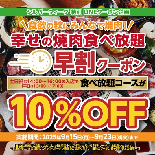 ワタミ株式会社(東京都大田区、以下ワタミ)と国内有数の和牛生産者であるカミチクグループ(鹿児島県鹿児島市)との合弁会社、ワタミカミチク株式会社(東京都大田区、以下ワタミカミチク)が展開する「かみむら牧場」は、2025年9月15日(月・祝)~9月23日(火・祝)までのシルバーウィーク期間中、公式LINE会員様限定で「幸せの焼肉食べ放題 早割クーポン」がご利用いただける特別企画を実施いたします。