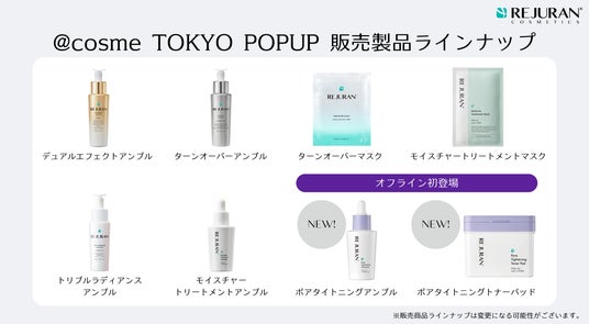 また、Qoo10メガ割企画などでも常にブランド売上上位を記録し、ブランドを代表するツヤ肌美容液"ゴールドアンプル"こと「c-PDRN デュアル エフェクト アンプル」をはじめ、"シルバーアンプル"「c-PDRN ターンオーバーアンプル」、1枚に40mlの美容液を贅沢に含んだ「c-PDRN ターンオーバーマスク」など人気商品も勢揃い。REJURAN COSMETICSの主要アイテムを一度に体験できる初めての場となります。