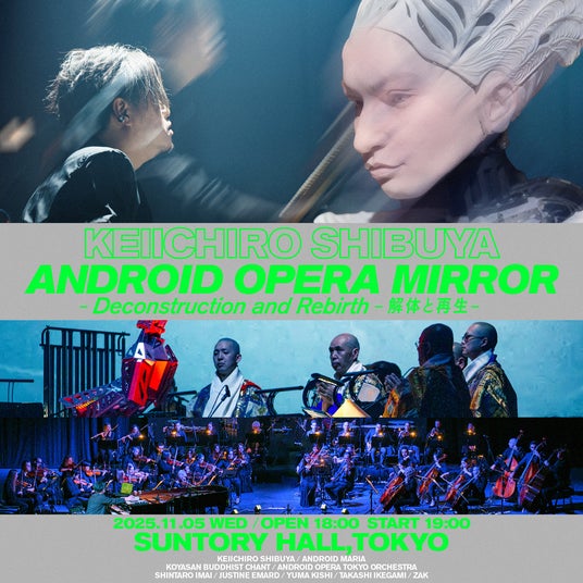 音楽家・渋谷慶一郎が代表を務めるアタック・トーキョー株式会社(ATAK)は、11月5日(水)サントリーホールにて「アンドロイド・オペラ『MIRROR』-Deconstruction and Rebirth -解体と再生-」を制作、発表いたします。本日よりチケットぴあにてチケットを販売開始します。