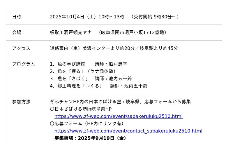 一般社団法人 海のごちそう推進機構と一般社団法人 海と日本プロジェクト岐阜は、魚を実際にさばくこと、地域の海洋変化や魚種の変遷を学ぶこと、さらに地域の郷土料理に根差した調理体験など、日本の豊かな海の食文化を継承し輪を広げる取り組み「日本さばける塾 in 岐阜県」を10月4日(土)に開催いたします。