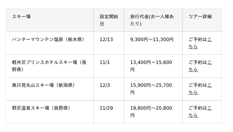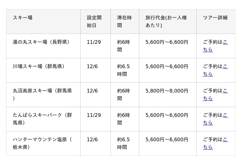 本ツアーは、11月~12月のシーズンインに向けて足慣らしに最適なスキー場を厳選し、全コースリフト券付きのお手頃価格日帰りプランとしてご用意。ファミリーや学生グループはもちろん、中上級者の"滑り初め"にもおすすめです。