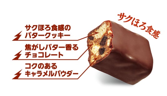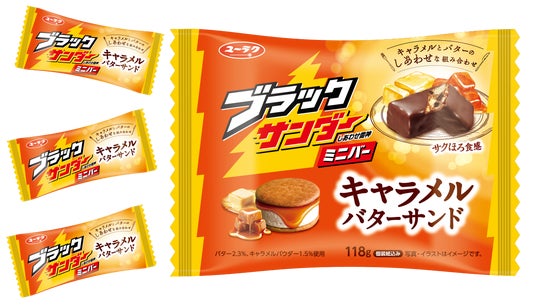 絶好調のブラックサンダーミニバーシリーズから、キャラメルとバターのしあわせな組み合わせが味わえる「キャラメルバターサンド」が新登場。焦がしバターが香るチョコレートに、サクほろ食感のバタークッキーとコクのあるキャラメルパウダーをぎゅっと閉じ込めました。