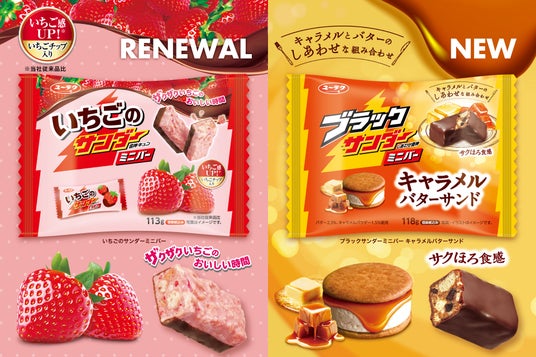 有楽製菓株式会社(本社:東京都小平市、代表取締役社長 河合辰信)は、ファミリーパックのブラックサンダーミニバーシリーズから新商品「ブラックサンダーミニバー キャラメルバターサンド」とリニューアル商品「いちごのサンダーミニバー」を2025年9月15日(月)より全国のスーパーマーケット、ドラッグストアなどで発売いたします。
