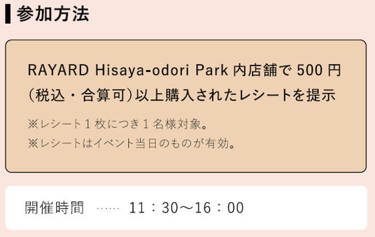 RAYARD Hisaya-odori Parkない店舗で1,000円(税込・合算可)以上購入されたレシートを提示