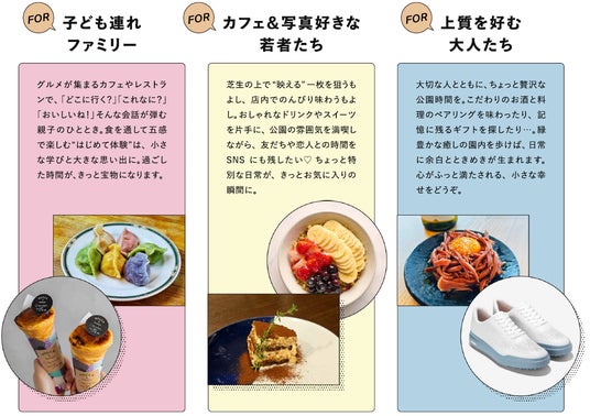 4:学生が贈る、とっておきの公園プラン♪「親子で"はじめましての食体験"を楽しむ」「芝生の上で"映え写真"を撮る」「大人のためのペアリングやギフト探し」ーさまざまな世代やシーンに合わせて、愛知学院大学経済学部・関ゼミの学生たちが園内のグルメやショップからおすすめをセレクト。ストーリーのある公園の過ごし方を提案します。