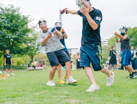 2:水鉄砲対戦型スポーツ 「ポイポイバトラー」おでこに付けた、金魚すくいで使う「ポイ」を水鉄砲で狙い撃ち!子どもから大人まで、運動が得意な人も苦手な人も盛り上がる新感覚スポーツエンターテイメントです。