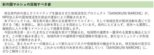 彩の国の魅力を一堂に集めた「彩の国マルシェ」に、ご家族・ご友人をお誘い合わせのうえ、ぜひご来場ください。