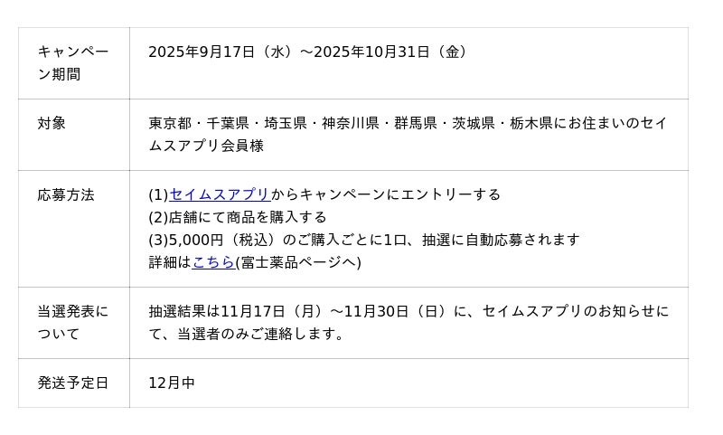 キャンペーン期間中、関東圏(※4)にお住まいのセイムスアプリ会員様に限り、ドラッグセイムスにて総額5,000円(税込)以上(※5)お買物をしていただいた方の中から、抽選で計5名様に全選手サイン入り公式試合球(2名様)または全選手サイン入りレプリカユニフォーム(3名様)をプレゼントします。(※6)