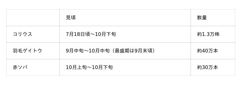 秋のフラワーリレーは、柔らかくふさふさとした円錐形の花穂が特徴の「羽毛ゲイトウ」から始まり、気温が下がると葉色の鮮やかさが増す「コリウス」、ピンク色の小花を無数に咲かせる「赤ソバ」などが次々とバトンを繋ぐように見頃を迎えます。