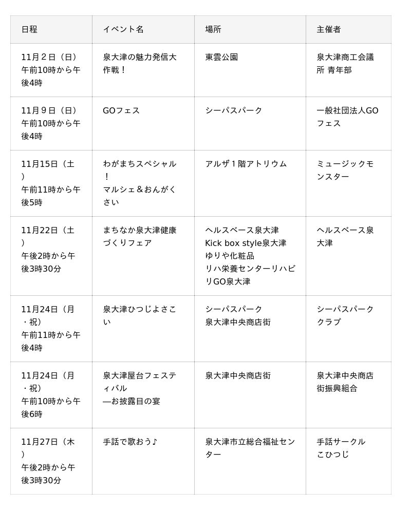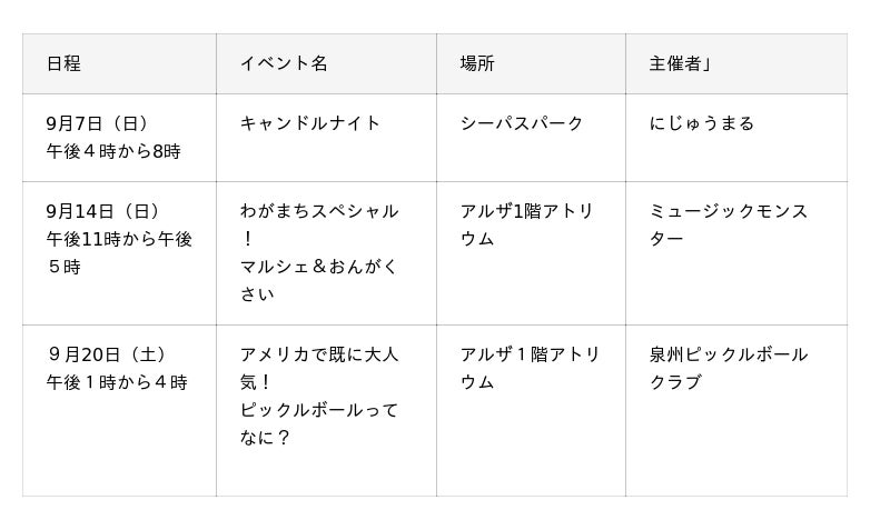 9月7日の「キャンドルナイト」を皮切りに、11月27日まで各団体がオリジナルイベントを実施します(全14イベント)。12団体がシーパスパーク・アルザアトリウム・テクスピア大阪・東雲公園・ヘルスベース・泉大津中央商店街などで、14イベントを実施し、秋のイベントシーズンを盛り上げます。