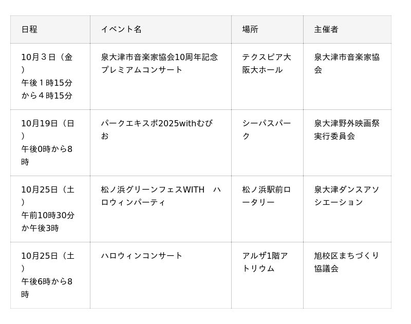 12団体がシーパスパーク・アルザアトリウム・テクスピア大阪・東雲公園・ヘルスベース・泉大津中央商店街などで、14イベントを実施し、秋のイベントシーズンを盛り上げます。