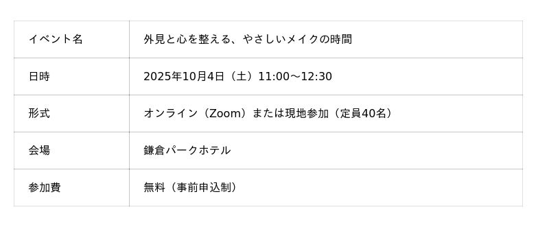 ユーシービージャパン株式会社(本社:東京都、メディカルアフェアーズ本部 希少疾患メディカルアフェーアズ部 部長 岩城 相憲)は、希少・難治性疾患とともに生きる方々を対象にした市民公開講座「外見と心を整える、やさしいメイクの時間」を、2025年10月4日(土)にオンラインおよび現地参加のハイブリッド形式にて開催いたします(参加無料・事前申込制)。