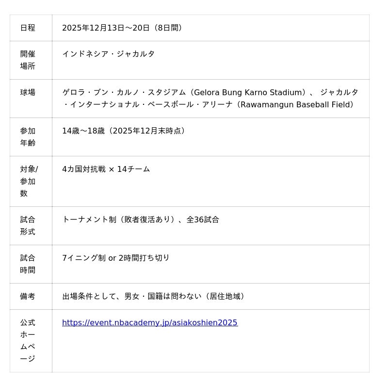 当社は、日本の伝統的な野球文化をアジア全域に普及させることを目指し、「アジア甲子園」を通じて若い世代のスポーツマンシップやチームワークの育成に貢献してきました。第1回大会は、2024年12月17日(火)から21日(土)にインドネシア・ジャカルタで開催され、多くの参加者と観客の皆様から大きな反響をいただきました。この成功を受けて、第2回大会ではさらに規模を拡大し、アジア地域からの参加を募ることで、地域間の交流と友好を深めることを目的としています。