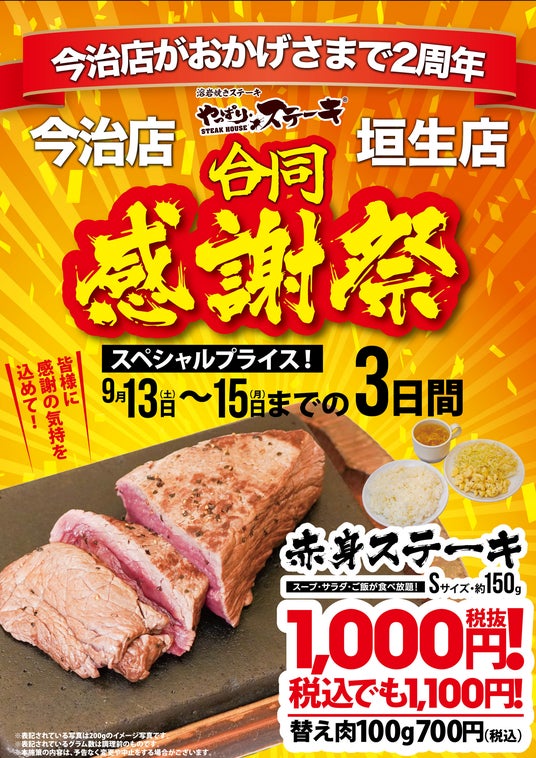 【やっぱりステーキ】今治店がオープンから2周年!日頃のご愛顧に感謝の気持ちをこめて垣生店と合同でお得な感謝祭を開催!