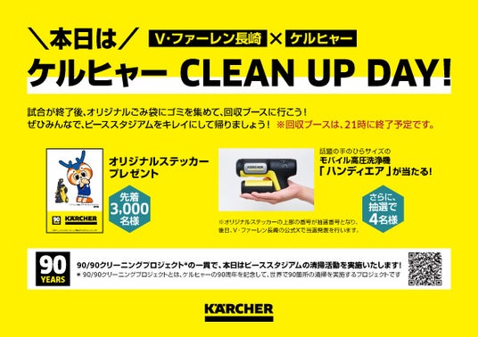 「ケルヒャーCLEAN UP DAY」は、ケルヒャーの創業90周年を記念し、世界90か所で清掃活動を行う「90/90クリーニングプロジェクト」の一環として開催されます。ケルヒャー ジャパンは、V・ファーレン長崎のプレミアムパートナーとして、チームとファン、サポーターのみなさまが大切にしているホームスタジアムを、よりクリーンで快適な場所にすることを目指し、本イベントを実施いたします。
