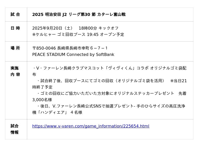 清掃機器の最大手メーカー、ドイツ・ケルヒャー社の日本法人、ケルヒャー ジャパン株式会社(本社:神奈川県横浜市港北区、代表取締役社長:柴田佳代子)は、2025年9月20日(土)に、プレミアムパートナーとしてスポンサー契約をしているV・ファーレン長崎のホームスタジアム「PEACE STADIUM Connected by SoftBank」で行われる「2025 明治安田J2リーグ 第30節 カターレ富山戦」を、冠試合「ケルヒャーCLEAN UP DAY」として開催いたします。