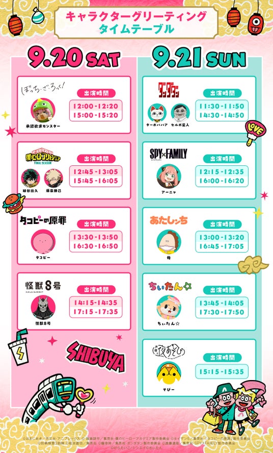 さらに今年初の試みとして、「SHIBUYA109渋谷店 店頭イベントスペース」にて、人気キャラとのキャラクターグリーティングも決定いたしました。『僕のヒーローアカデミア』デクくん&爆豪くんをはじめ、『あたしンち』母、『怪獣8号』怪獣8号、『SPY×FAMILY』アーニャ、『タコピーの原罪』タコピー、『ダンダダン』ターボババア&セルポ星人、『ぼっち・ざ・ろっく!』承認欲求モンスター、『声優と夜あそび 2025』そびー、さらに体を張ったチャレンジ動画が人気のゆるキャラ"ちぃたん☆"まで、全11キャラクターが、9月20日(土)、21日(日)に「SHIBUYA109渋谷店 店頭イベントスペース」に登場。参加方法は公式HPをご確認ください。