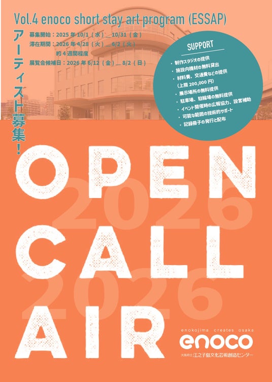 大阪府立江之子島文化芸術創造センター[enoco]では、Vol.4 enoco short stay art program (ESSAP) 2026年の開催が決定しました。関西を拠点に活動する若手アーティストを対象に、創作拠点を無償提供し、創作・発表をサポートするプログラムです。皆様のご応募を心よりお待ちしています。