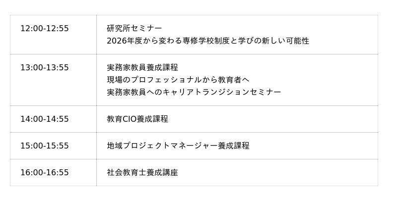 〇研究科:実務家教員養成課程/社会教育士養成講座/地域プロジェクトマネージャー養成課程/教育CIO養成課程