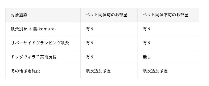 施設に関しましては弊社直営施設「ドッグヴィラ千葉南房総」「秩父別邸 木叢-komura-」「埼玉秩父キャンプ&グランピング Riverside Camp Field CHICHIBU」よりご選択いただけます。