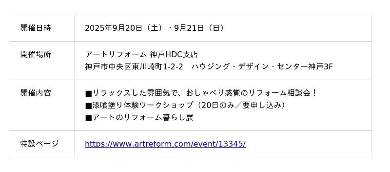 全国でリフォーム・リノベーション工事を年間6,500件以上手がける株式会社アートリフォーム(本社:大阪府吹田市、代表者:代表取締役社長 大本哲也、以下「アートリフォーム」)は、大人気のワークショップやリフォーム相談会など、暮らしにまつわる企画が盛りだくさんのイベント「アートリフォーム暮らしフェスタ」を2025年9月20日(土)~21日(日)に、旗艦店舗である神戸HDC支店にて開催します。