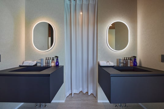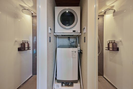 1階には独立したシャワールームを2室備え、それぞれの間には洗濯乾燥機を1台ずつ設置。プールやジャグジーを楽しんだ後でもすぐに利用できるため、アクティビティ後のケアもスムーズです。隣接する洗面台はダブルボウル仕様で、複数人が同時に利用できるため、身支度の時間が重なっても快適に過ごせます。