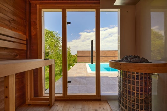 木の香りが漂う室内は、ガラス張りの扉によって圧迫感のない開放的な雰囲気に。扉の向こうにはプールや緑が広がり、外の景色を眺めながらサウナを楽しめます。サウナ室からプールやととのいチェアがある外気浴スペースへの導線も整っており、快適に "ととのう" 体験が完結する設計となっています。