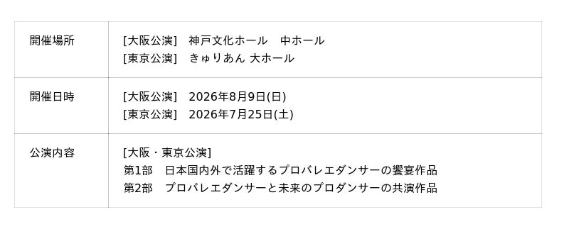 バレエ・ダンス用品のマーティ株式会社(本社:東京都港区三田2-14-4 三田慶応ビジデンス1F)が、バレエアンサンブルガラ2026公演を2026年7月25日(土)・2026年8月9日(日)に開催します。この公演は、国内外で活躍するプロダンサーとプロの世界を目指している未来のプロダンサーたちが共演するバレエ公演で、毎年、夏に開催されています。今年は7月に関東・東京会場、8月に関西・大阪会場の2開場にて、規模を拡大し盛大に開催されることが決定いたしました。